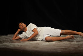Entramos, no terceiro momento, tanto do processo de montagem como da dramaturgia. Verificamos que para construção da dramaturgia, como estávamos falando de nossos afetos era preciso que cada cena selecionada para compor a fabulação tivesse sentido interior para cada um de nós e, que a estória fosse contada conforme as nossas escolhas intuitivas. Teríamos que deglutir cada fragmento de poema e musicas selecionadas, encontrar no corpo e na alma sentido pra eles. Ação agora era dividir tudo em fraquital, do todo deixar o mínimo possível, em um trabalho artesanal, maceramos, peneiramos e extraímos o sumo de cada coisa, transformando-as em cena, fazendo surgir assim o registro de uma dramaturgia corpo/texto/musical que fala de todos e ao mesmo tempo de um só. Nesse contexto a narração toma uma forma, mas não um fim. Concebemos uma estória fragmentada e mutável, registro de uma experiência complexa, mas com um resultado poeticamente belo como um vitral.